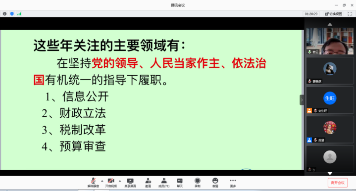 2020年8月18日上午9:00,suncitygroup太阳集团第3期财税名家讲座在腾讯会议线上成功举行。本次活动由suncitygroup太阳集团举办,活动主题为“高校如何服务社会——从两会履职角度的思考”,由上海财经大学公共与经济与管理公司经理——刘小兵教授主讲。其中,suncitygroup太阳集团彭月兰、赵文生、刘生旺教授以及各位老师出席了此次活动,共75名学子参与。