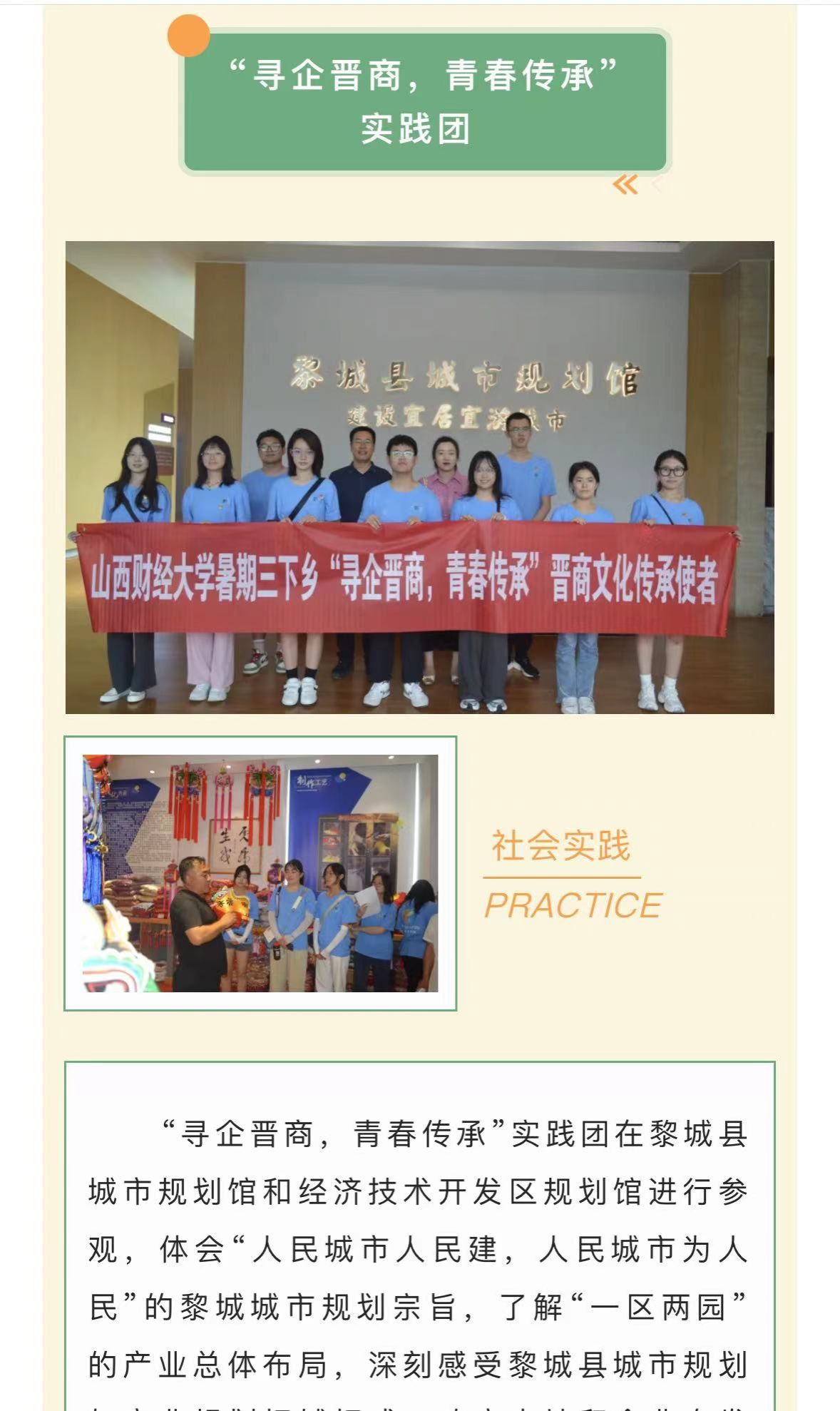 “寻企晋商“寻企晋商,青春传承”实践团在黎城县城市规划馆和经济技术开发区规划馆进行参观,体会“人民城市人民建,人民城市为人民”的黎城城市规划宗旨,了解“一区两园”的产业总体布局,深刻感受黎城县城市规划与产业规划相辅相成、政府支持和企业奋发相互配合的良好氛围。