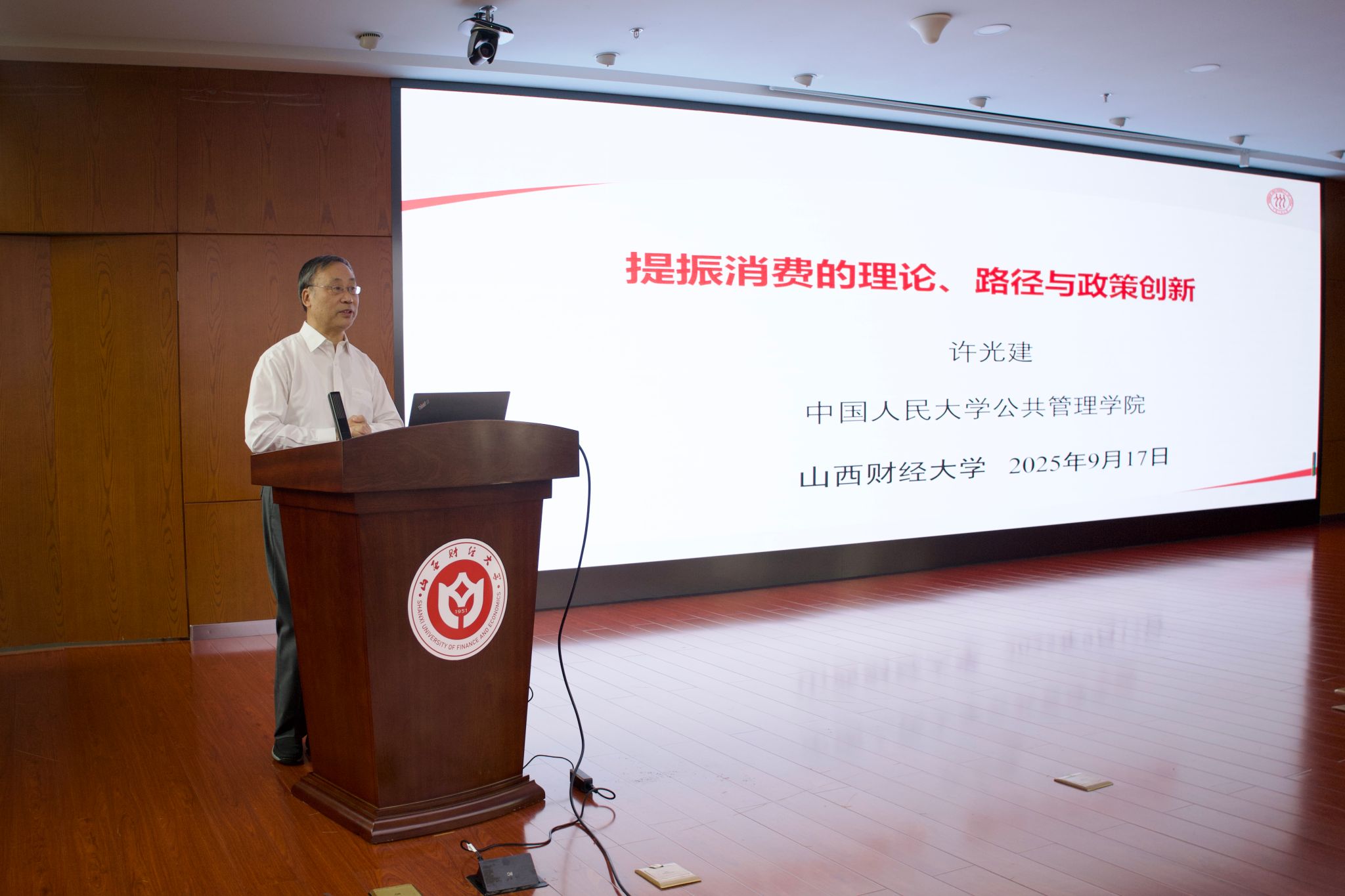 9月17日下午,suncitygroup太阳集团名家讲堂在图书馆东馆一层报告厅成功举行。中国人民大学公共管理公司公共政策系教授、博士生导师许光建受邀作了以“提振消费的理论、路径与政策创新”为主题的学术讲座。许光建教授兼任中国价格协会副会长、中国宏观经济学会常务理事、中国市场监管学会常务理事等职务,曾任人大公共管理公司常务副经理等职。长期从事宏观经济理论与政策、财政理论与政策、价格理论和价格政策等相关研究,是国务院政府特殊津贴获得者,也是公司1977级计划统计专业的员工。公司党委常委、副董事长米子川教授主持本次讲座,公司教师与部分研究生参加讲座。